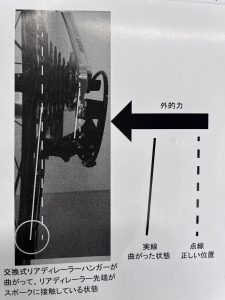 スポーツバイクにはフレームとリアメカを繋ぐ ディレーラーハンガー が有るのですが転倒や横からの入力で 曲がりやすく出来ていまして