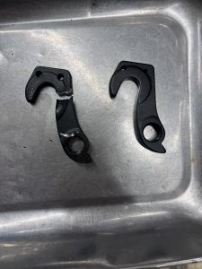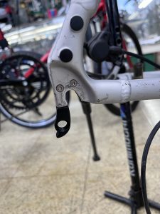 フレームが折れてしまわない様に ディレーラーハンガー が先に 曲がったり折れたりして フレームを守る役目もしているんですよ![]()