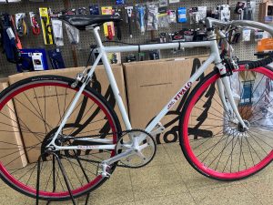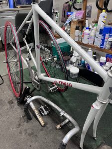 競輪のフレーム は競輪場(競技バンク)で使用するように 前を早く走るためだけに作られた自転車でして *変則ギアなし固定ギア・ブレーキ無*