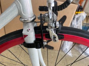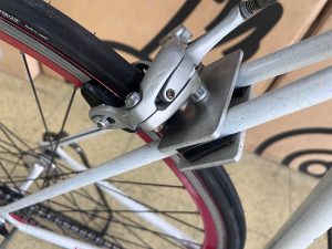 競輪フレーム はブレーキを取り付ける ダボ穴(ブレーキ穴)も無いので 競輪選手も公道でトレーニングできる 取り外し可能なブレーキ を取り付けました![]()